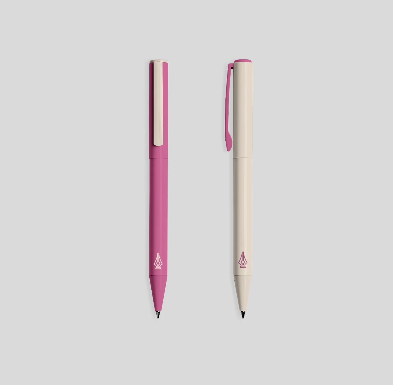 gri zemin uzerinde pembe - bej iki adet plastik kalem